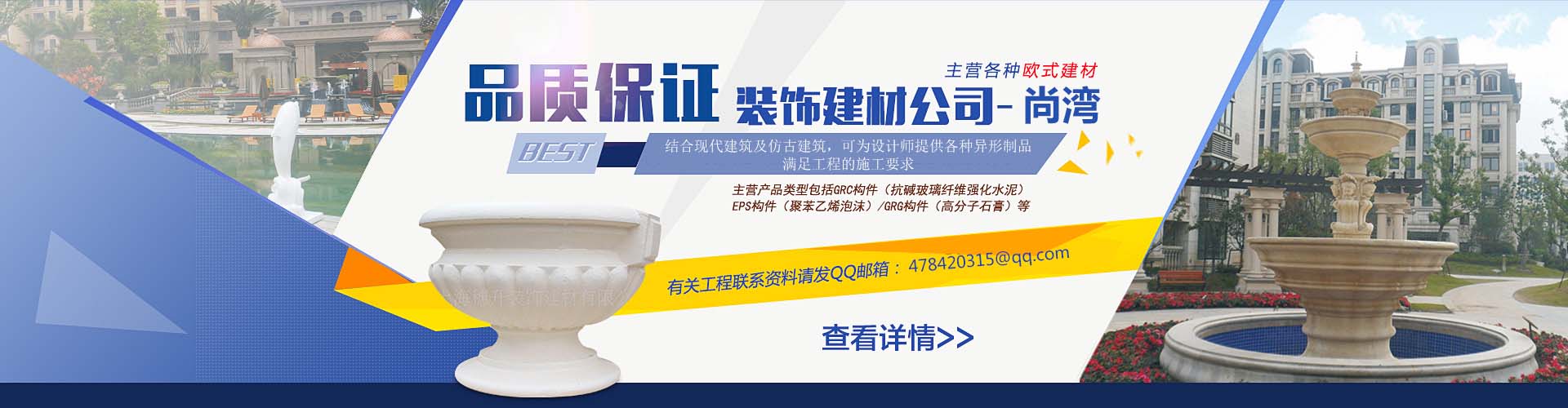上海尚灣建材有限公司是一家集室內(nèi)外設(shè)計(jì)、生產(chǎn)、制作、安裝、GRG構(gòu)件、GRC歐式構(gòu)件、EPS構(gòu)件、浮雕、雕塑、假山、假樹(shù)、砂巖工藝品、玻璃鋼工藝品的專(zhuān)業(yè)生產(chǎn)廠家。根據(jù)甲方提供的設(shè)計(jì)圖紙,按圖紙加工各種材料的GRC歐式構(gòu)件,EPS線條、室內(nèi)外砂巖、玻璃鋼浮雕及圓雕、藝術(shù)圍欄、現(xiàn)場(chǎng)安裝施工、真石漆、乳膠漆噴涂等圍繞整個(gè)建筑裝飾工程的全方位施工,并且結(jié)合現(xiàn)代建筑及仿古建筑,可為設(shè)計(jì)師提供各種異形制品,滿足工程的施工要求。